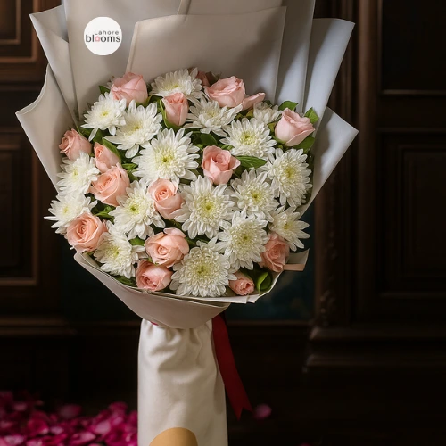 If you are looking for a soft, elegant pink and white bouquet in Lahore, the Blush Harmony Roses & Chrysanthemum Bouquet from Lahore Blooms is a beautiful choice. Delicate blush pink roses are combined with white chrysanthemums and wrapped in ivory paper, creating a calm, romantic and very photogenic bouquet.