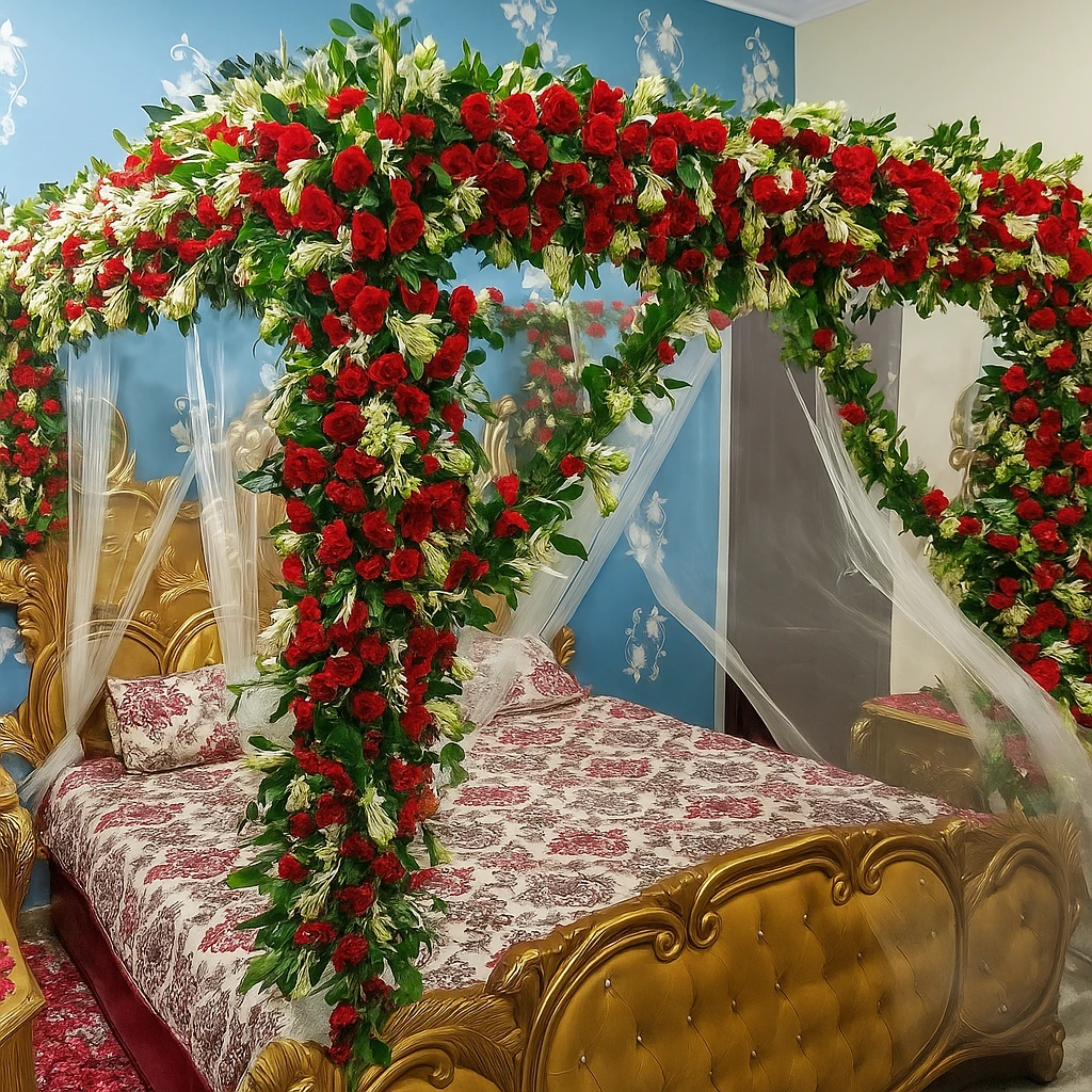 Ideal for shab-e-zoafa (first wedding night), reception night or high-budget bridal room setups, this style is perfect for large master bedrooms in houses and villas across Lahore. Our team delivers, installs and styles the full canopy and floral work at your home, making sure everything is secure, comfortable and absolutely picture-perfect.