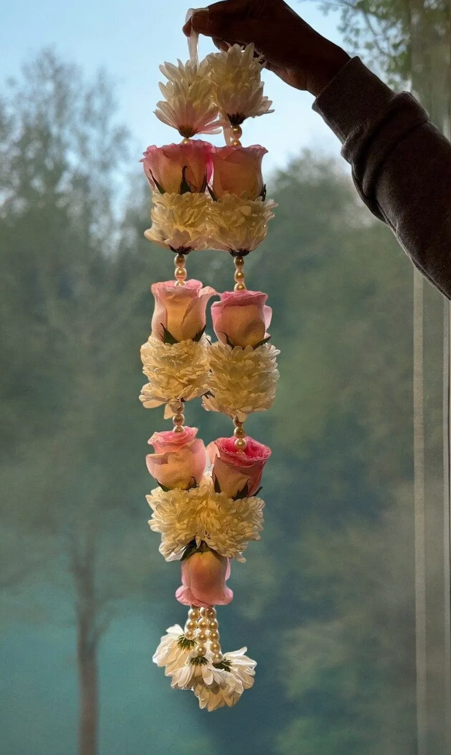 Pink roses symbolize grace, admiration, and gentle love while white chrysanthemums represent purity and joyful celebration — together creating a phool mala that feels both meaningful and visually stunning against any bridal outfit, from deep reds to pastels and ivory.