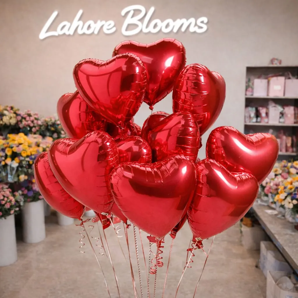 Nothing sets the mood for love and celebration quite like a bunch of vibrant red heart-shaped foil balloons. Whether you’re planning a birthday surprise, a romantic anniversary setup, a Valentine’s Day gift, or a proposal backdrop — these glossy helium-filled heart balloons from Lahore Blooms are the perfect finishing touch.