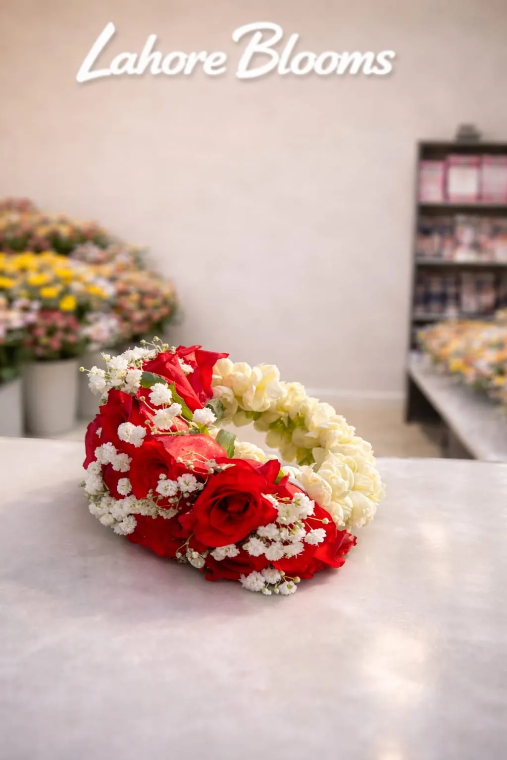 Few combinations are as timeless and beloved as red roses paired with white baby’s breath. This handmade fresh flower gajra pair from Lahore Blooms brings together the bold romance of red roses with the soft, airy elegance of gypsophila — creating a gajra that is as beautiful on your wrist or in your hair as it is fragrant throughout your special day.