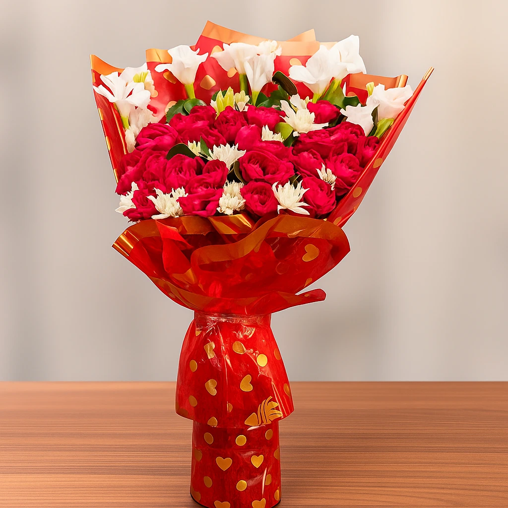 If you want a soft yet passionate romantic red rose bouquet Lahore couples will love, this Romantic Red Rose Bouquet from Lahore Blooms is a beautiful choice. Deep red roses are paired with delicate white flowers and hand-tied in cute heart-printed wrapping, creating a bouquet that feels warm, loving and perfect for special moments.