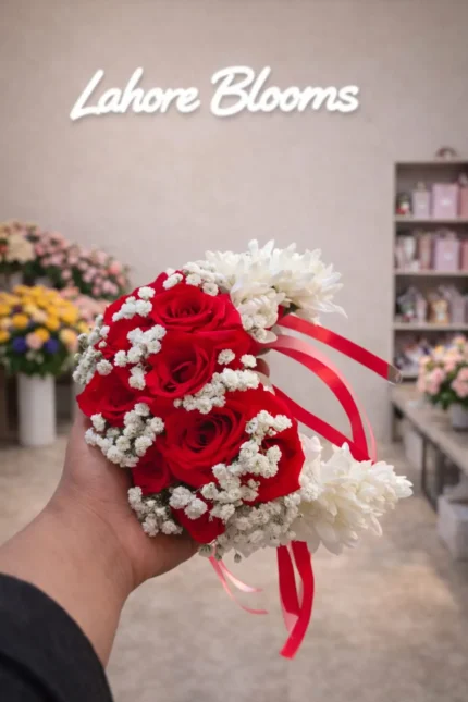 Looking for a romantic red roses and chocolate bouquet in Lahore? This luxury black wrap bouquet includes fresh red roses paired with Dairy Milk chocolates, beautifully arranged for birthdays, anniversaries, and special surprises. Same-day delivery available across Lahore at discounted price Rs 1450.